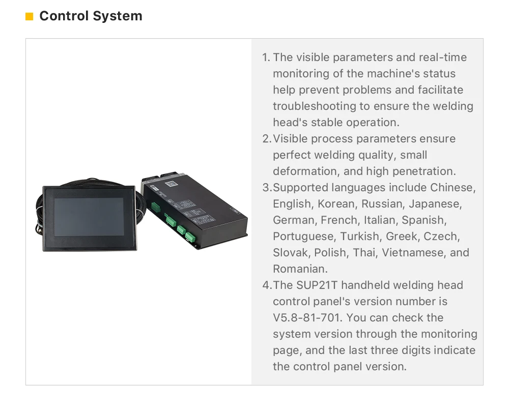 2.The entire machine is more stable, with all parameters visible and thestatus of the machine monitored in real-time to prevent problems andfacilitate troubleshooting. Faults are investigated and solved to ensurethe hand-held welding head works stably.